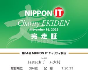11月16日(日)、東京お台場シンボルプロムナード公園で開催された「第14回NIPPON IT チャリティ駅伝」に当社駅伝部が参加しました。当日は社長以下応援団の声援の下、5人のメンバーが出場し、堂々たる走りを披露しました。
