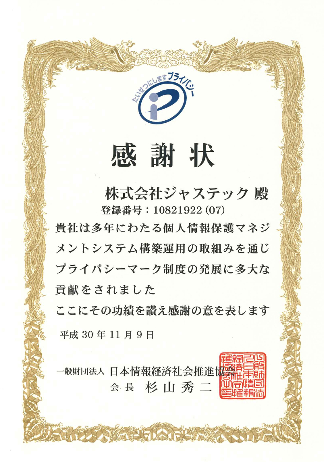当社は、永年の個人情報保護活動に対し、平成30年11月9日、(財)日本情報経済社会推進協会(JIPDEC)より感謝状を授与されました。